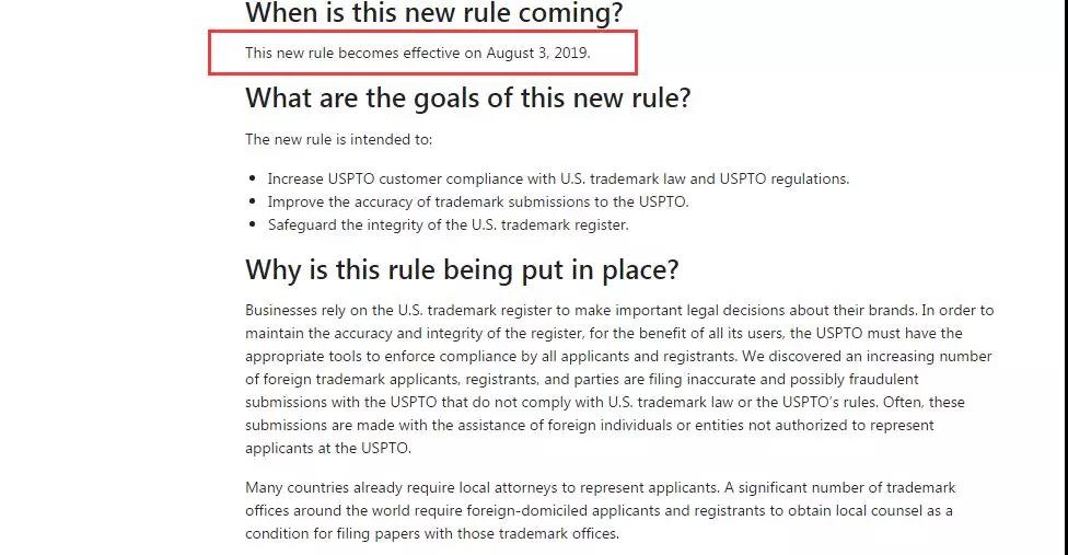 7月2日,美國專利商標(biāo)局(USPTO)官宣:新的商標(biāo)規(guī)則,要求外國商標(biāo)申請人必須由在美國執(zhí)業(yè)的律師代理,新商標(biāo)規(guī)則的生效日期為2019年8月3日。