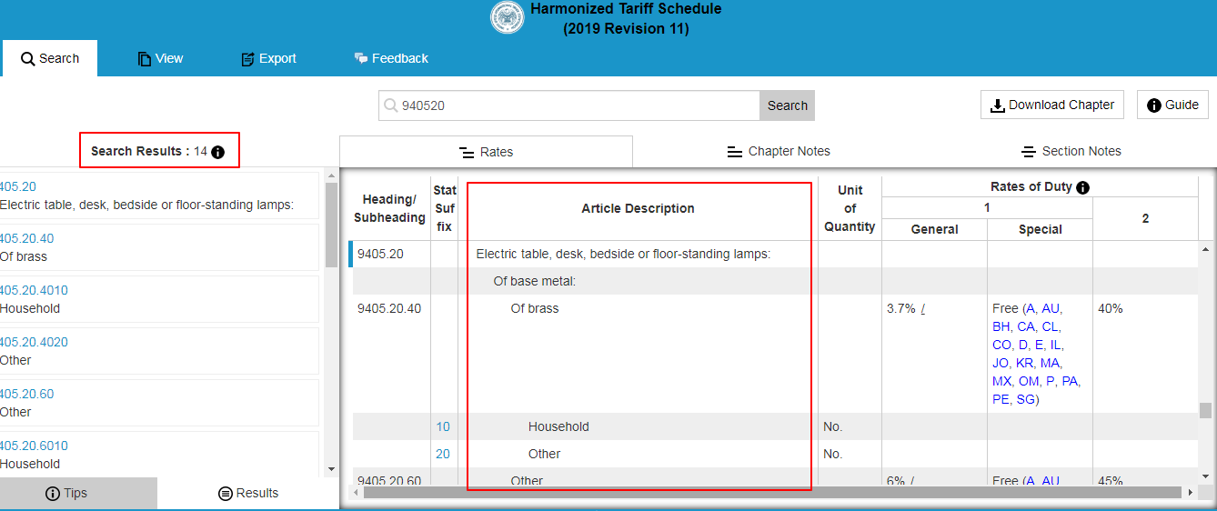 進(jìn)入上述網(wǎng)站,在搜索框中輸入中國HS CODE的前六位數(shù),如臺燈940520****,根據(jù)產(chǎn)品描述選擇準(zhǔn)確的HTS CODE。