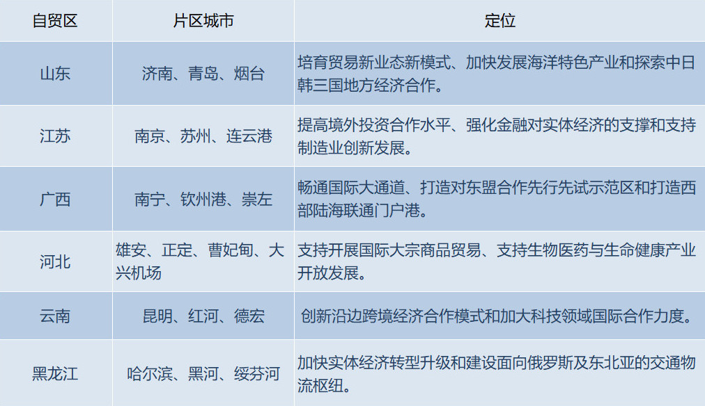 8月26日,國(guó)務(wù)院印發(fā)《中國(guó)(山東)、(江蘇)、(廣西)、(河北)、(云南)、(黑龍江)自由貿(mào)易試驗(yàn)區(qū)總體方案》。8月30日,6個(gè)新設(shè)自貿(mào)試驗(yàn)區(qū)正式掛牌成立。隨著山東、江蘇、河北新設(shè)自貿(mào)區(qū),我國(guó)沿海省份自貿(mào)區(qū)實(shí)現(xiàn)全覆蓋;而廣西、云南、黑龍江新設(shè)自貿(mào)區(qū),則讓自貿(mào)區(qū)在沿邊地區(qū)首次落地生根。