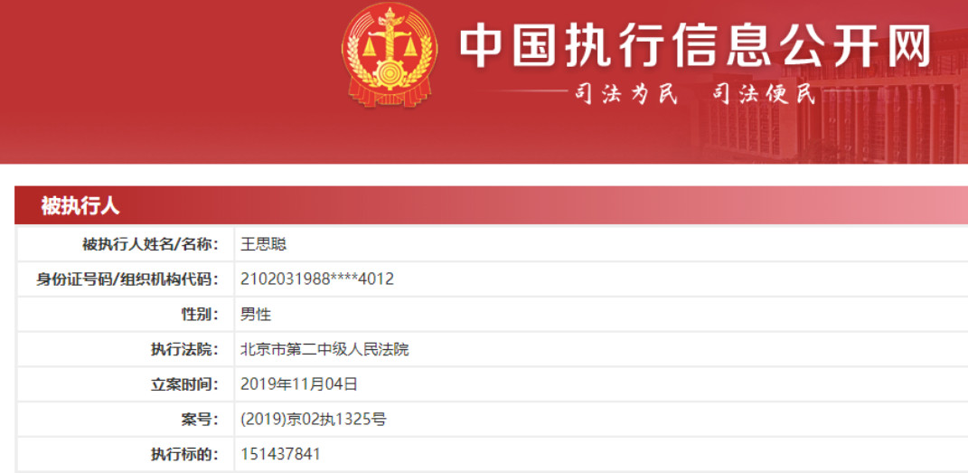 11月4日,王思聰被北京市第二中級(jí)人民法院列為被執(zhí)行人,執(zhí)行標(biāo)的151437840.0,約1.5億。隨后北京二中院采取了凍結(jié)賬戶存款、查封房產(chǎn)、車輛、限制高消費(fèi)等執(zhí)行措施。