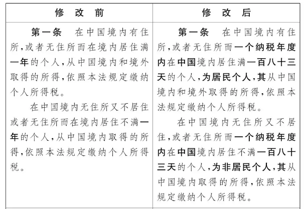 依據(jù)財政部部長劉昆關(guān)于《中華人民共和國個人所得稅法修正案(草案)》的說明,個稅法對財政居民的規(guī)則已做更改:將“在我國境內(nèi)居住的時間”作為斷定居民個人和非居民個人的依據(jù),由“是否居住滿1年”調(diào)整為“是否居住滿183天”。詳細條文更改請見下圖: