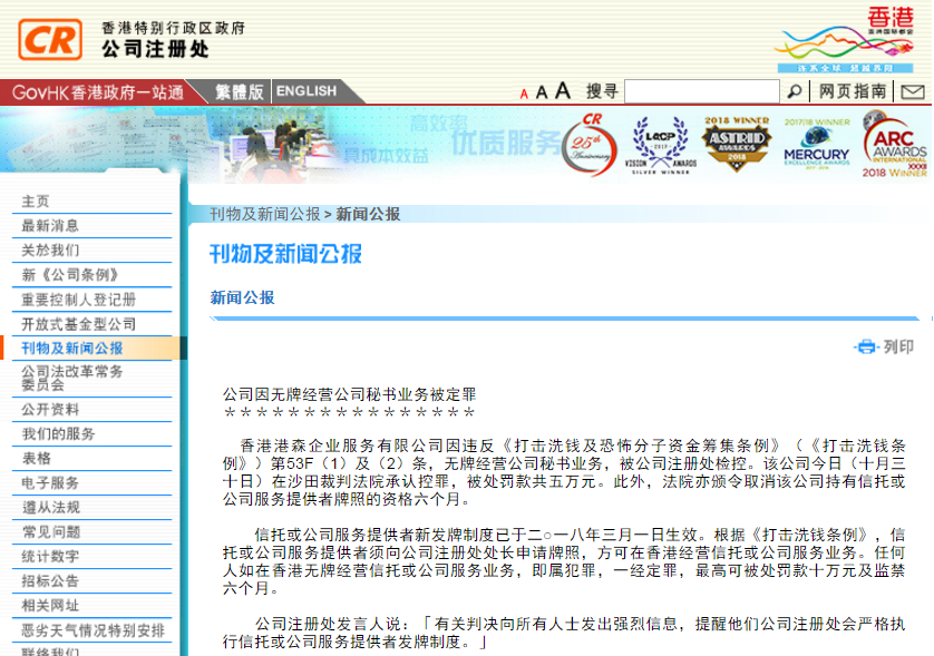 據(jù)中國香港特別行政區(qū)政府公司注冊(cè)處最新官方刊物及新聞公報(bào),中國香港港森企業(yè)服務(wù)有限公司因違反《打擊洗錢及恐怖分子資金籌集條例》(《打擊洗錢條例》)第53F(1)及(2)條,無牌經(jīng)營公司秘書業(yè)務(wù),被公司注冊(cè)處檢控。該公司今日(十月三十日)在沙田裁判法院承認(rèn)控罪,被處罰款共五萬元。此外,法院亦頒令取消該公司持有信托或公司服務(wù)提供者牌照的資格六個(gè)月。