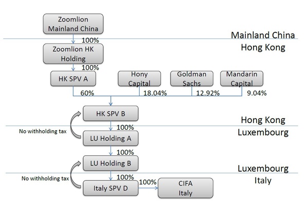 HK中有3個(gè)投資方進(jìn)入,Zoomlion HK Holding和 HK SPV B的存在確保了不管投資方如何變動,中國香港往上到中國和中國香港向下到盧瑟堡的結(jié)構(gòu)不會受影響。
