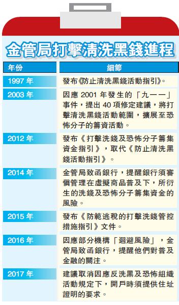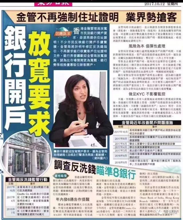 2018年上半年新措施實(shí)施后,一般客戶開戶,只需填報(bào)地址,而毋須再因反洗黑等規(guī)定而要提交住址證明以作核實(shí),有望大大提升開戶的時(shí)間。但在此次審核要求有所放寬的同時(shí),金管局打擊洗錢及恐怖分子資金籌集的力度并未減弱,金管局確認(rèn),正在對(duì)8間銀行進(jìn)行反洗錢調(diào)查。