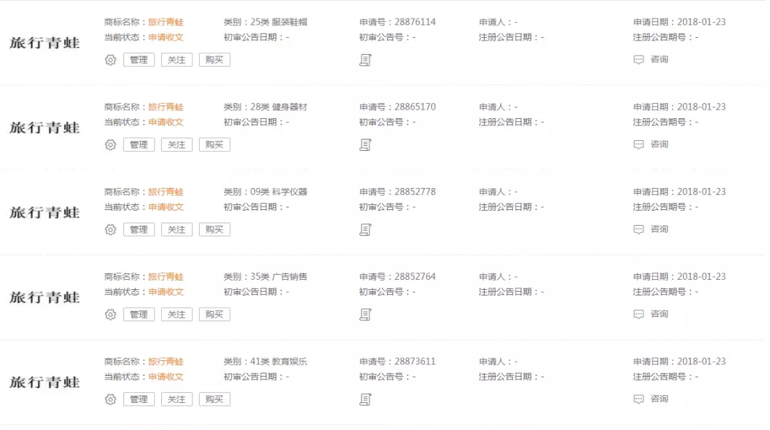 通過商標(biāo)檢索發(fā)現(xiàn),已有人于1月23日,率先在第9類等類別申請(qǐng)注冊(cè)了"旅行青蛙"商標(biāo)。因?yàn)椴荒塬@知第9類商標(biāo)注冊(cè)申請(qǐng)人的基本信息,因此目前第9類旅行青蛙商標(biāo)注冊(cè)申請(qǐng)人是否為HIT-POINT公司還是個(gè)迷。