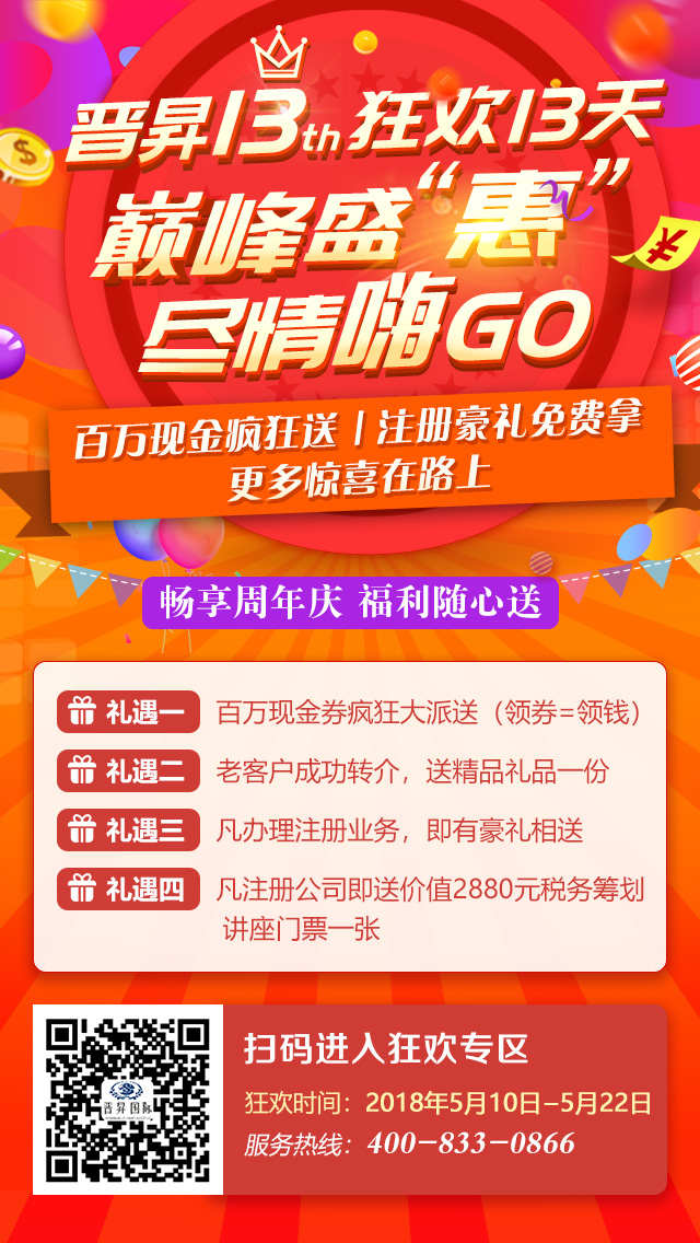 福利到!晉昇十三周年慶典,巔峰盛"惠"第一波福利強勢來襲!"感恩十三年,狂歡十三天"!百萬現(xiàn)金券瘋狂大派送!掃碼領(lǐng)券等于領(lǐng)錢!中國香港、海外公司立減1488元!更有繽紛豪禮隨心送!多重優(yōu)惠同時享!周年慶典感恩回饋!越早下單,優(yōu)惠越大!抓住機會,盡情嗨GO~~~