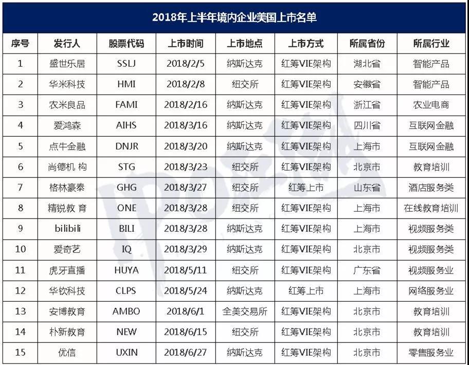 2018 年上半年境內(nèi)企業(yè)美國上市概況