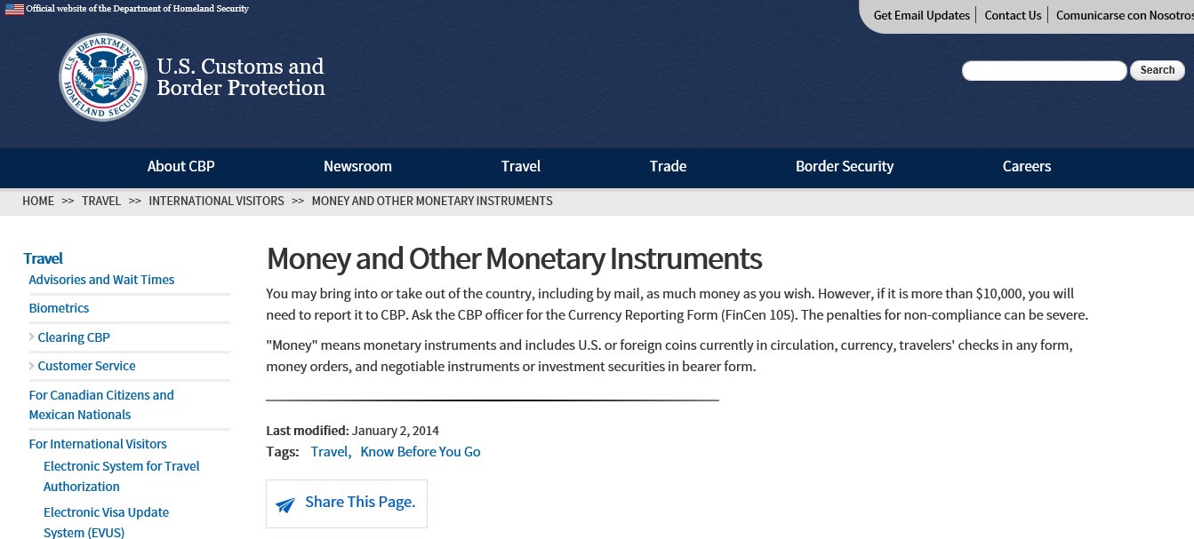 美國海關及邊境保護局(CBP)規(guī)定,游客攜帶超過1萬美元現(xiàn)金、旅行支票或者其它貨幣等,都須向海關申報,并對現(xiàn)金的來源作出合理解釋,例如現(xiàn)金如果來自所出售房產,務必出示出賣房產的憑據(jù)等。如不申報,當事人最高可面臨50萬美元的罰款及10年以上有期徒刑。