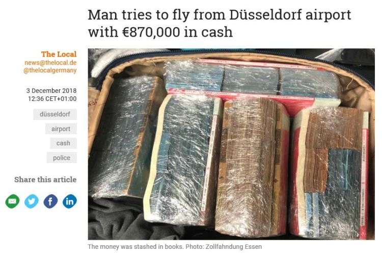 據(jù)德國海關當局稱,近期在德國西部Dusseldorf機場,一名安檢人員發(fā)現(xiàn)一名26歲華人登機時,箱內的物品異常,隨即要求開箱檢查,經工作人員檢查發(fā)現(xiàn),箱內有87萬歐元現(xiàn)金均被該華人偽裝成中文書籍,試圖攜帶離境。
