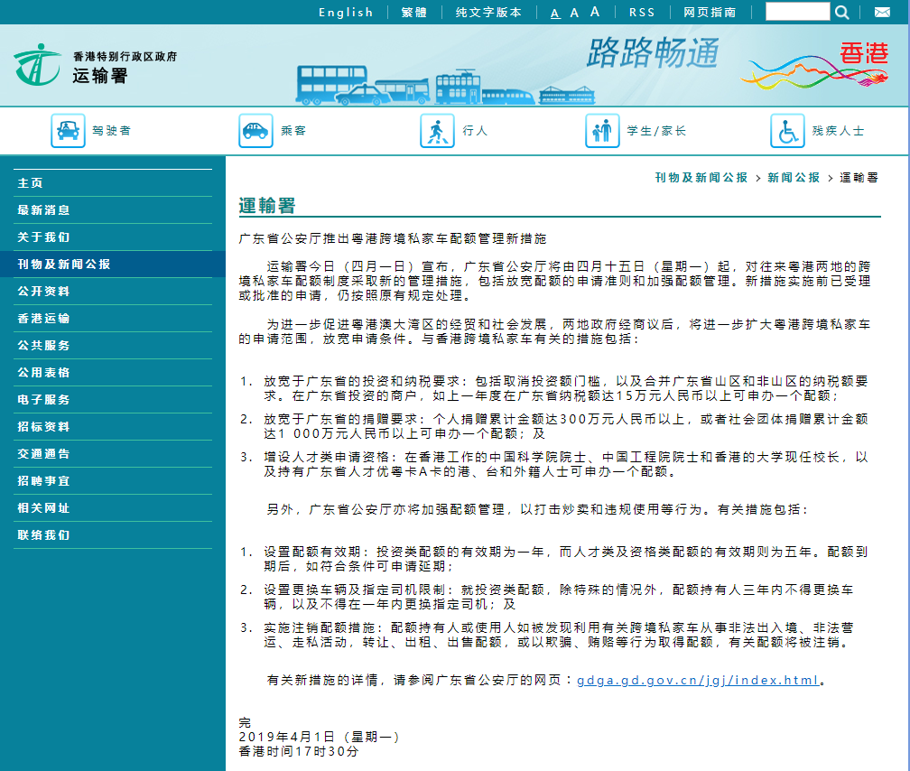 中國(guó)香港運(yùn)輸署正式4月1日宣布,廣東省公安廳4月15日起,對(duì)往來粵港兩地的跨境私家車配額制度采取新的管理措施,包括放寬配額的申請(qǐng)準(zhǔn)則和加強(qiáng)配額管理。(新措施實(shí)施前已受理或批準(zhǔn)的申請(qǐng),仍按照原有規(guī)定處理。)