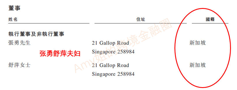 但直到消息被證實(shí)是在2018年上市之期。根據(jù)2018年海底撈向港交所遞交的招股說(shuō)明書(shū),公司負(fù)責(zé)人的國(guó)籍、住址一列顯示,張勇、舒萍夫婦二人的國(guó)籍、住址均在新加坡。